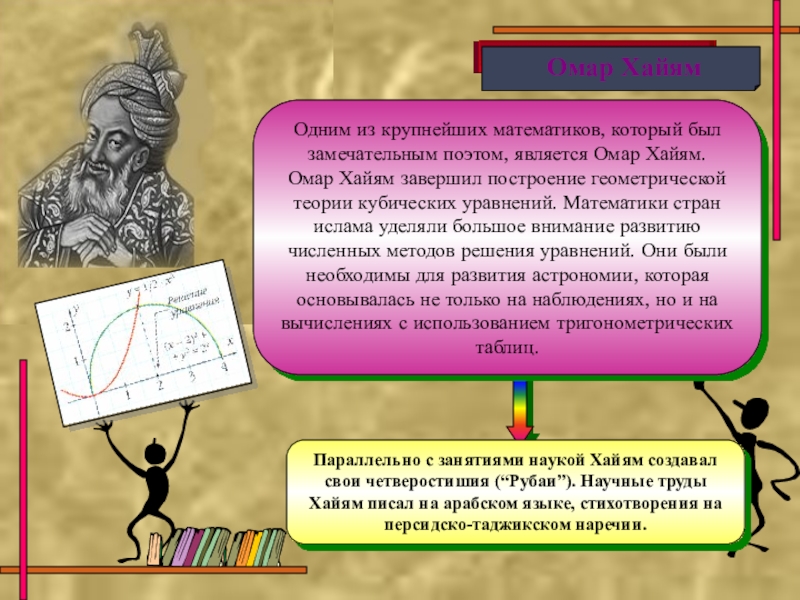 Омар Хайям завершил построение геометрической теории кубических уравнений. Математики стран ислама уделяли большое внимание развитию численных методов решения уравнений. Они были необходимы для развития астрономии, которая основывалась не только на наблюдениях, но и на вычислениях с использованием тригонометрических таблиц.