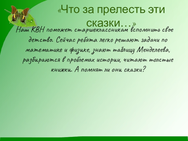 Сейчас ребята легко решают задачи по математике и физике, знают таблицу Менделеева, разбираются в проблемах истории, читают толстые книжки. А помнят ли они сказки?