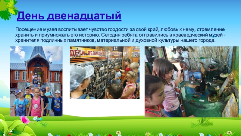 День двенадцатыйПосещение музея воспитывает чувство гордости за свой край, любовь к нему, стремление хранить и приумножать его