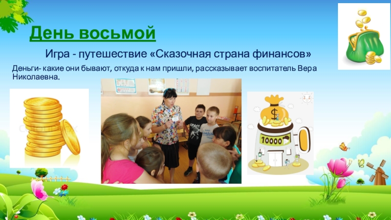 День восьмойИгра - путешествие «Сказочная страна финансов»Деньги- какие они бывают, откуда к нам пришли, рассказывает воспитатель Вера