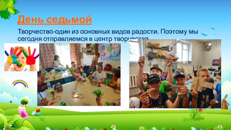 День седьмойТворчество-один из основных видов радости. Поэтому мы сегодня отправляемся в центр творчества.