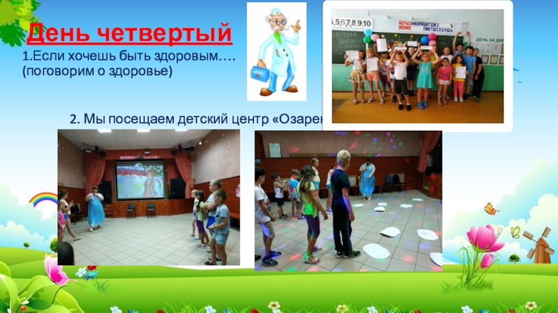 День четвертый1.Если хочешь быть здоровым…. (поговорим о здоровье)2. Мы посещаем детский центр «Озарение»