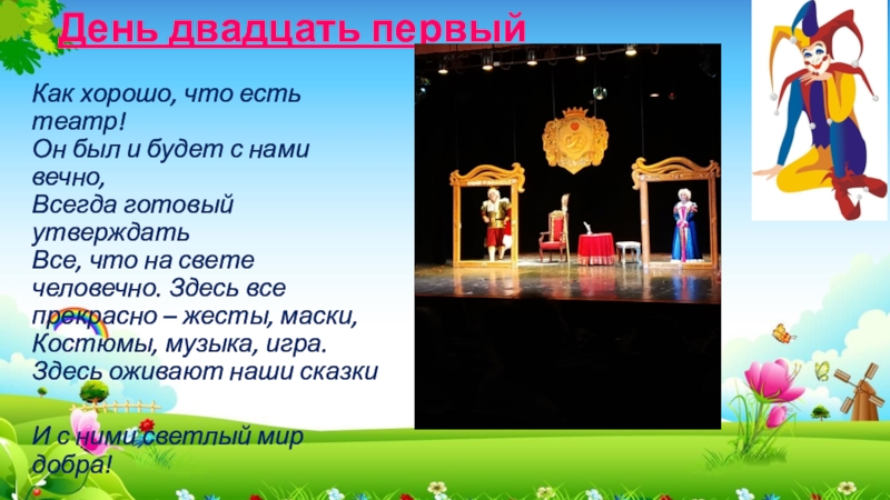День двадцать первыйКак хорошо, что есть театр! Он был и будет с нами вечно, Всегда готовый утверждать