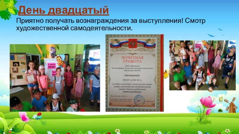 День двадцатыйПриятно получать вознаграждения за выступления! Смотр художественной самодеятельности.