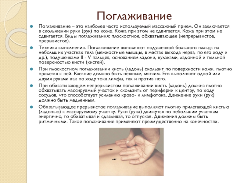скольжении руки (рук) по коже. Кожа при этом не сдвигается. Кожа при этом не сдвигается. Виды поглаживания: плоскостное, обхватывающее (непрерывистое, прерывистое).