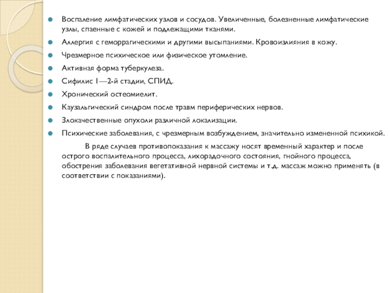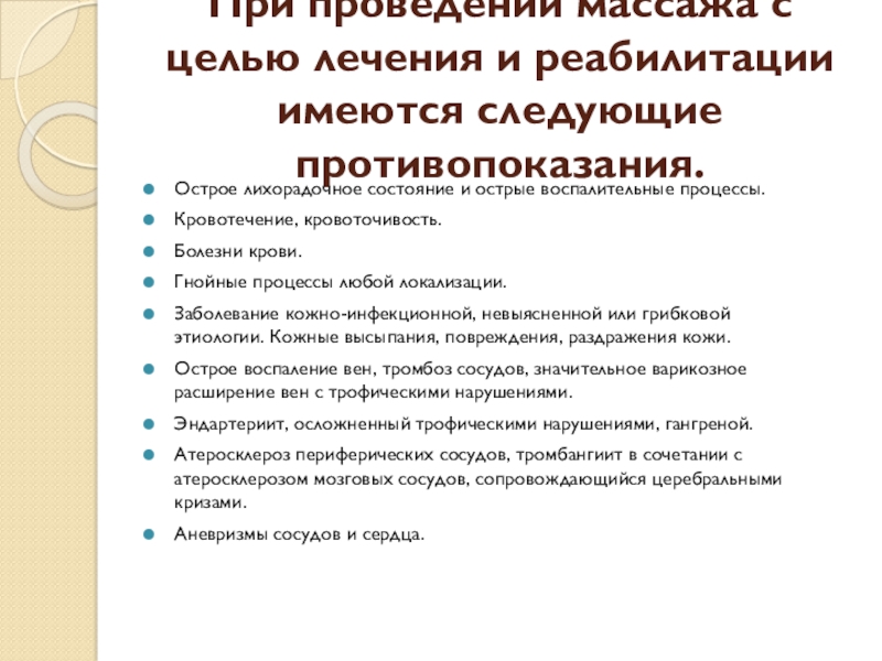 Слайд 16При проведении массажа с целью лечения и реабилитации имеются следующие противопоказания.