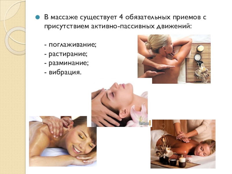 Слайд 11В массаже существует 4 обязательных приемов с присутствием активно-пассивных движений: