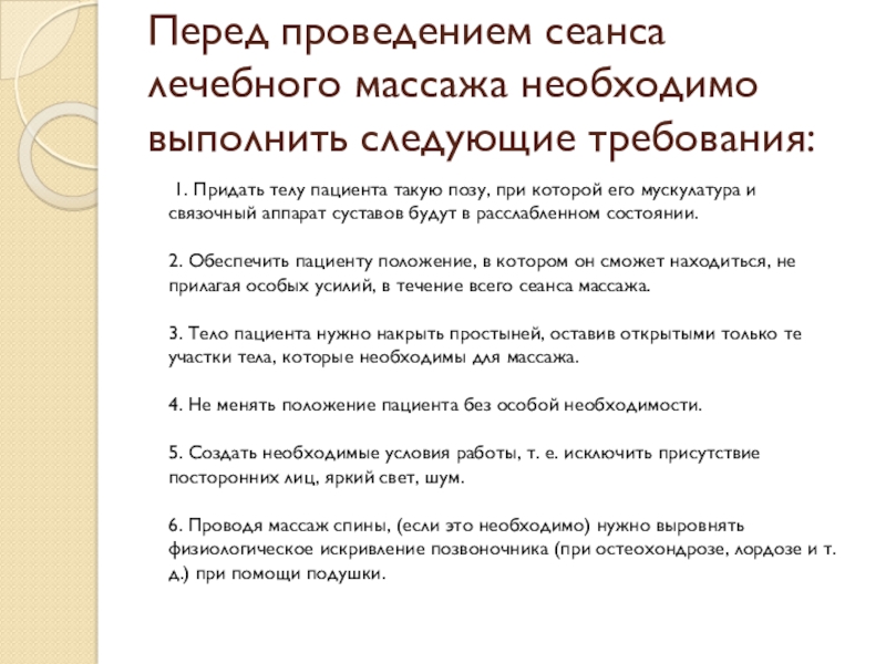 Слайд 9Перед проведением сеанса лечебного массажа необходимо выполнить следующие требования: