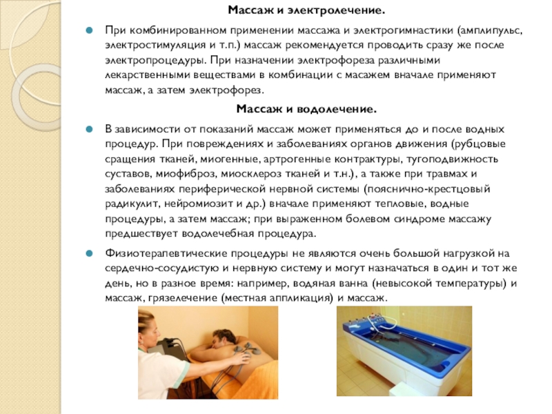 комбинировать с различными физиотерапевтическими процедурами: водными, светолечением, электролечением и т.д. Физические методы лечения подготавливают ткани тела к массажу. Например, целесообразно предварительно согреть конечности, кожная температура которых понижена (парезы, параличи), или уменьшить болезненность, чтобы появилась возможность углубления массажа, и т.д.