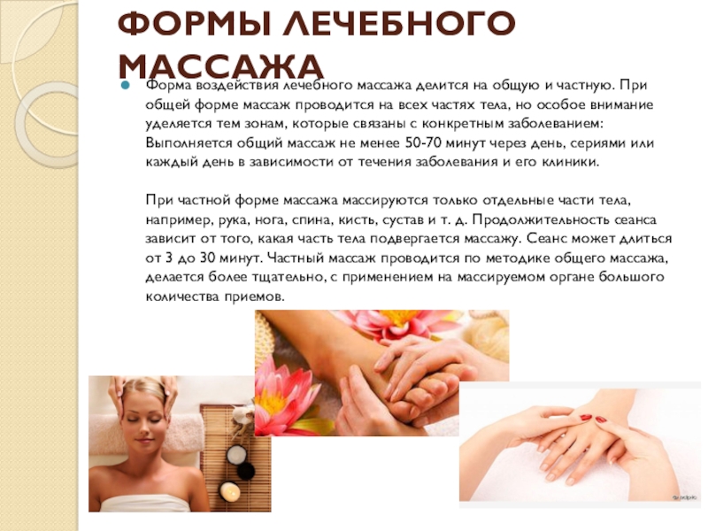 Слайд 8ФОРМЫ ЛЕЧЕБНОГО МАССАЖА