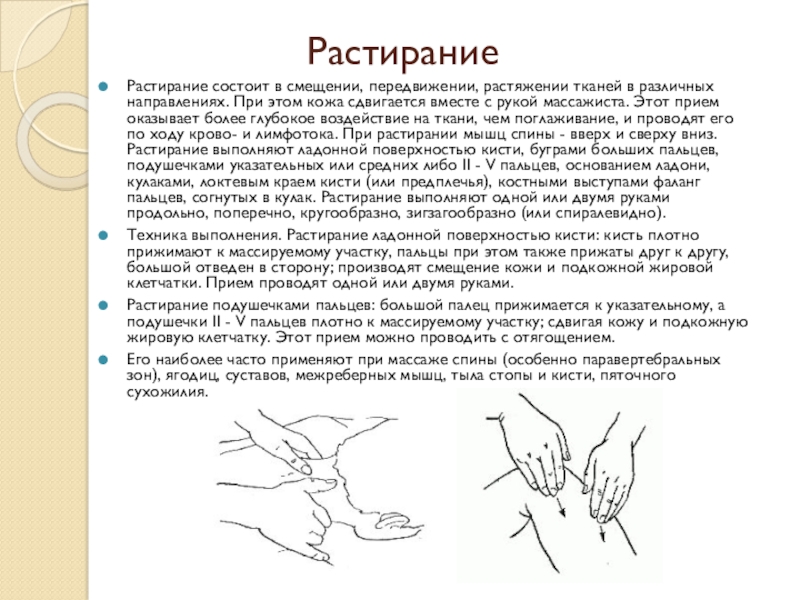 Растирание состоит в смещении, передвижении, растяжении тканей в различных направлениях. При
