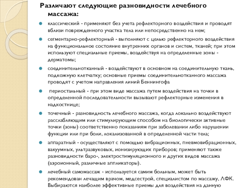 Слайд 3Различают следующие разновидности лечебного массажа: