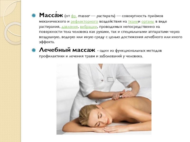 Слайд 2Масса́ж (от фр. masser — растирать) — совокупность приёмов механического и рефлекторного воздействия на ткании органы в виде растирания, давления, вибрации, проводимых непосредственно на