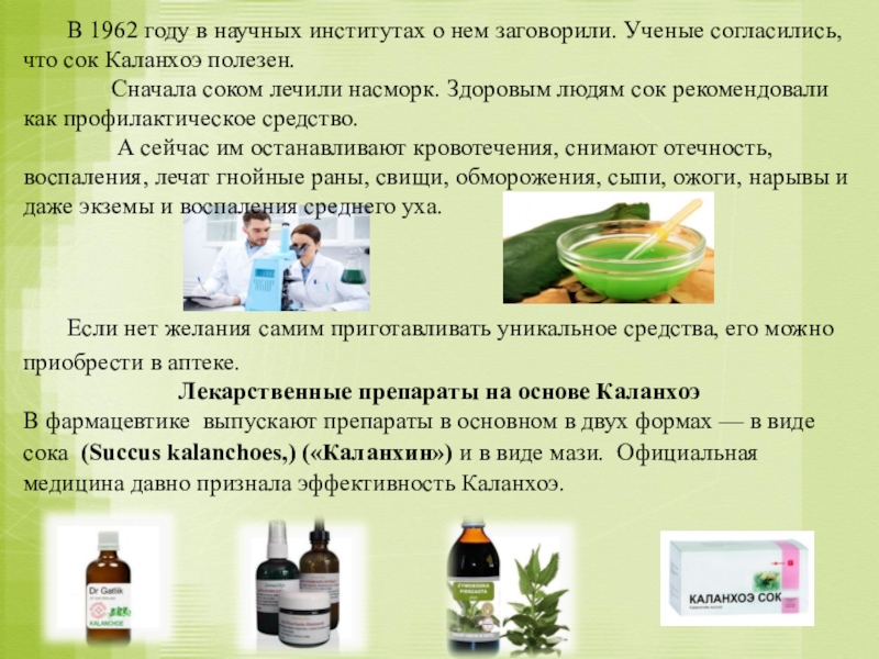 В 1962 году в научных институтах о нем заговорили. Ученые согласились, что сок Каланхоэ полезен.