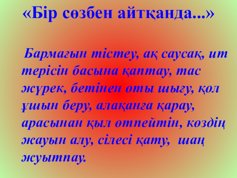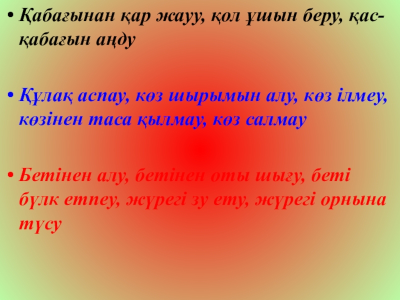 Слайд 13Қабағынан қар жауу, қол ұшын беру, қас-қабағын аңду