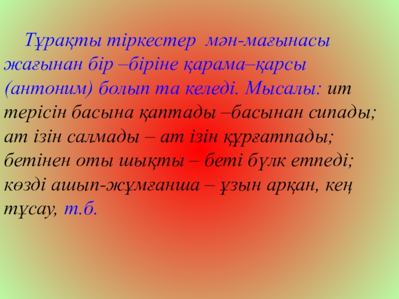 Тұрақты тіркестер мән-мағынасы жағынан бір –біріне қарама–қарсы