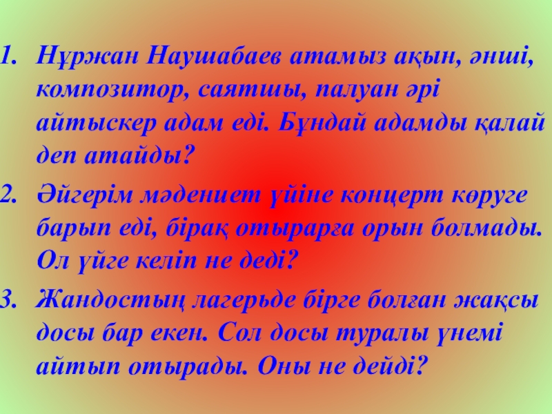 сонан соң оларға балама болатын жекелеген сөздермен мінездеме беріңдер.