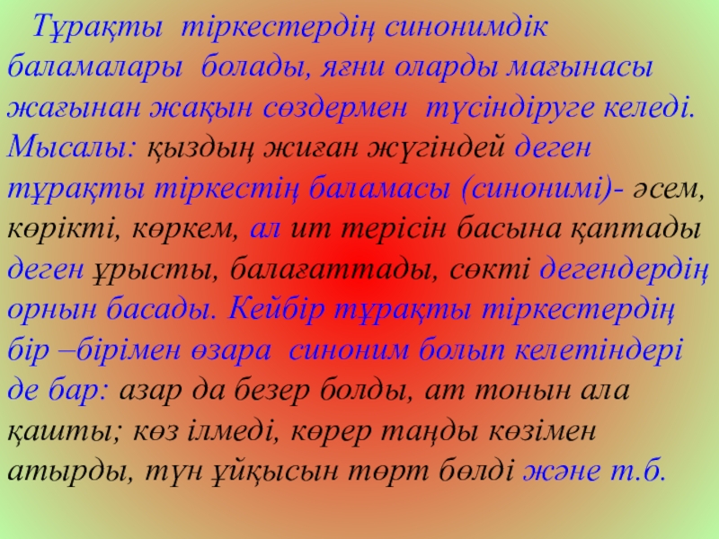 Слайд 6 Тұрақты тіркестердің синонимдік баламалары болады, яғни оларды мағынасы жағынан