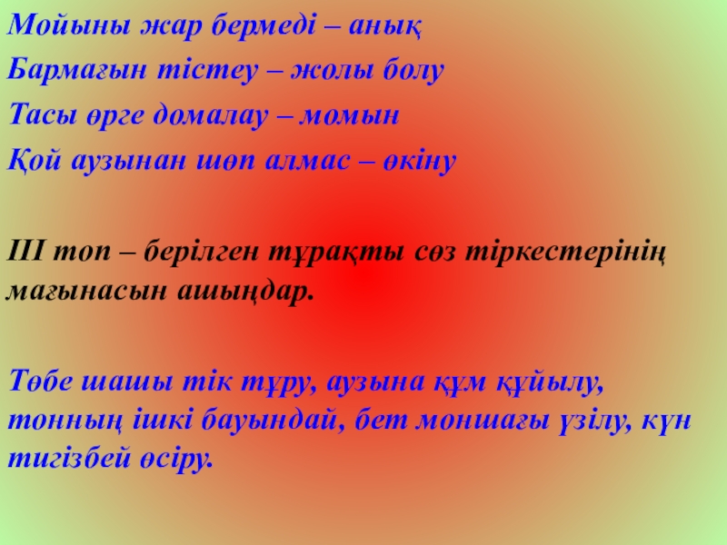 ІІІ топ – берілген тұрақты сөз тіркестерінің мағынасын ашыңдар.