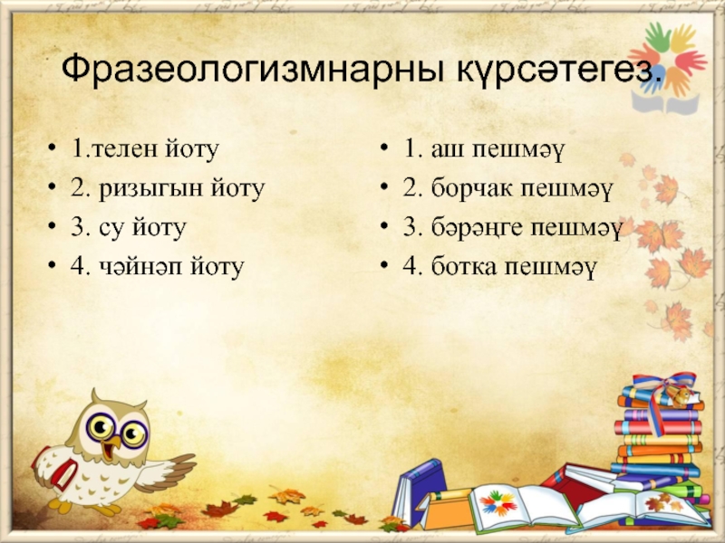 Слайд 11 Түбәндәге сүзләр белән туры һәм күчерелмә мәгънәле сүзтезмәләр төзеп языгыз.