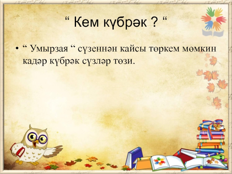 “ Кем күбрәк ? ““ Умырзая “ сүзеннән кайсы төркем мөмкин кадәр күбрәк сүзләр төзи.