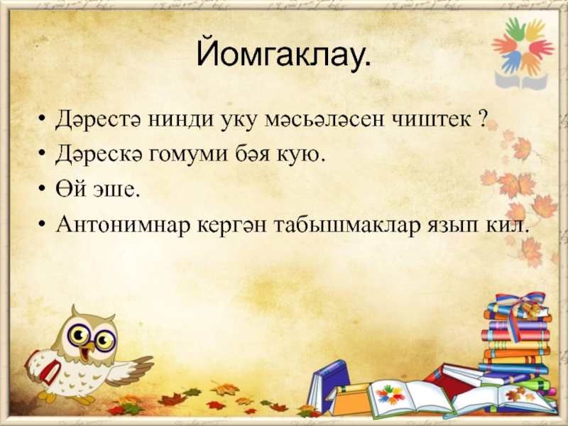Йомгаклау.Дәрестә нинди уку мәсьәләсен чиштек ?Дәрескә гомуми бәя кую.Өй эше.Антонимнар кергән табышмаклар язып кил.