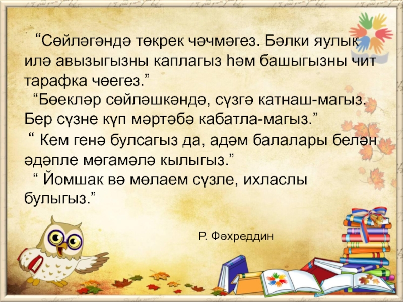 чит тарафка чөегез.” “Бөекләр сөйләшкәндә, сүзгә катнаш-магыз. Бер сүзне күп мәртәбә кабатла-магыз.” “ Кем генә булсагыз да, адәм балалары белән әдәпле мөгамәлә кылыгыз.” “ Йомшак вә мөлаем сүзле, ихласлы булыгыз.” Р. Фәхреддин