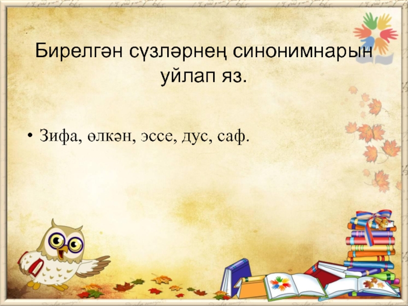 Слайд 15 Бирелгән сүзләрнең синонимнарын уйлап яз.
