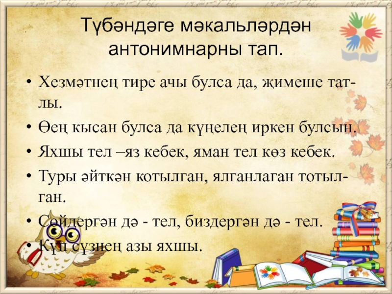 Слайд 14Түбәндәге мәкальләрдән антонимнарны тап.