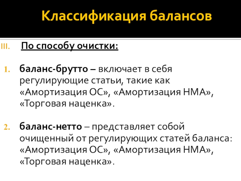 баланс-нетто – представляет собой очищенный от регулирующих статей баланса: «Амортизация ОС», «Амортизация НМА», «Торговая наценка».