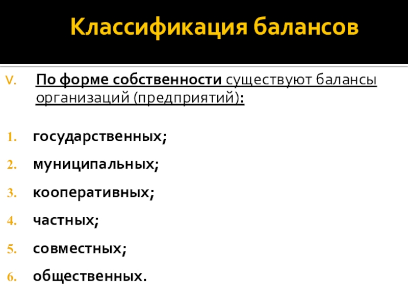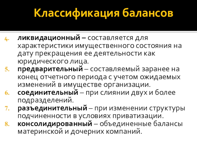 ликвидационный – составляется для характеристики имущественного состояния на дату прекращения