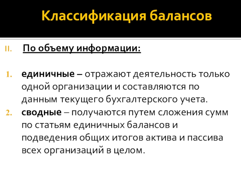 сводные – получаются путем сложения сумм по статьям единичных балансов и подведения общих итогов актива и пассива всех организаций в целом.