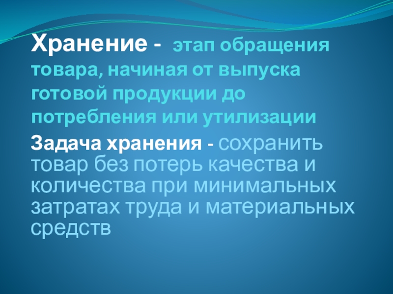 Слайд 13Хранение - этап обращения товара, начиная от выпуска готовой продукции до