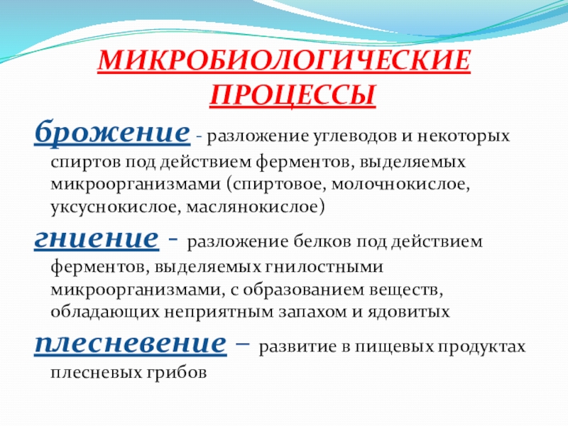 жизнедеятельностью микроорганизмов, для которых многие пищевые продукты служат хорошей питательной средой (брожение, плесневение, гниение)