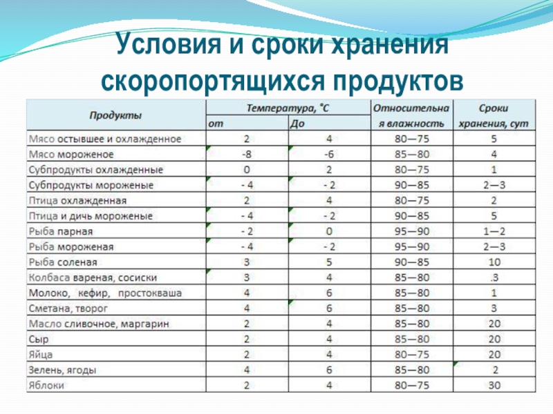 Слайд 11Условия и сроки хранения скоропортящихся продуктов