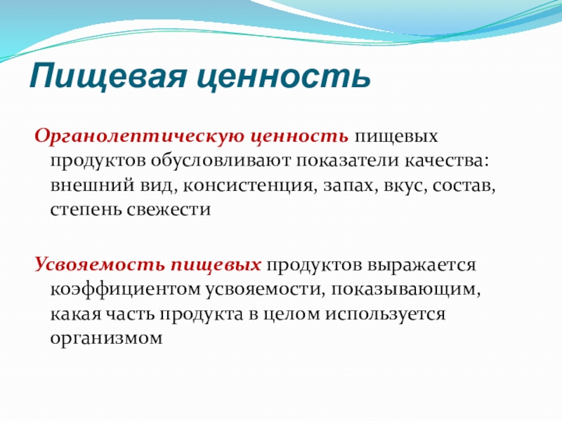 Органолептическую ценность пищевых продуктов обусловливают показатели качества: внешний вид, консистенция,
