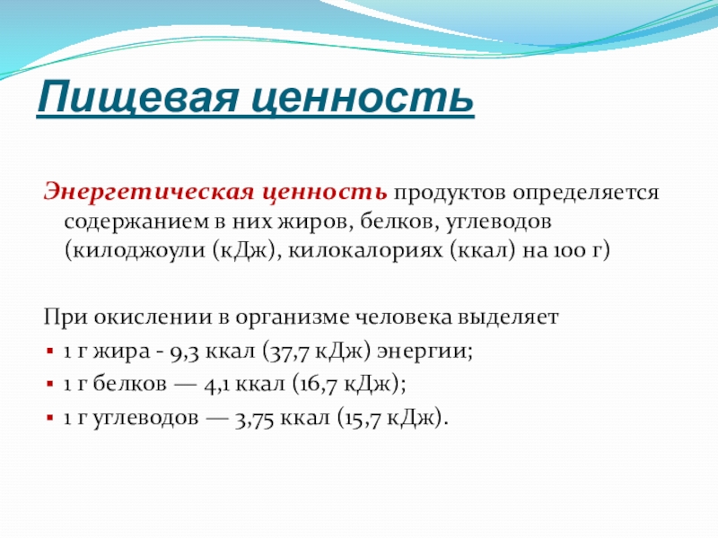 Энергетическая ценность продуктов определяется содержанием в них жиров, белков, углеводов
