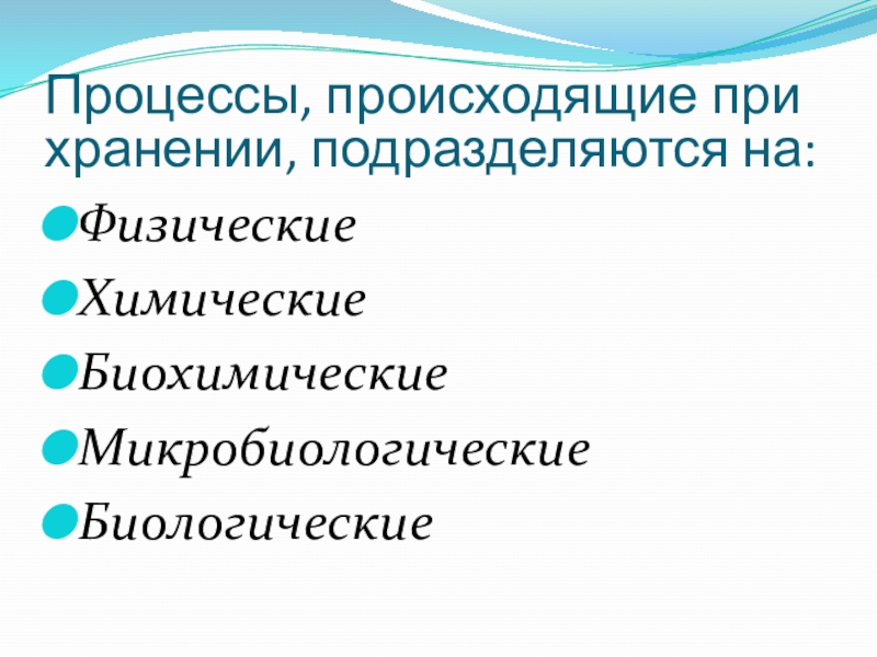 Слайд 14Процессы, происходящие при хранении, подразделяются на: