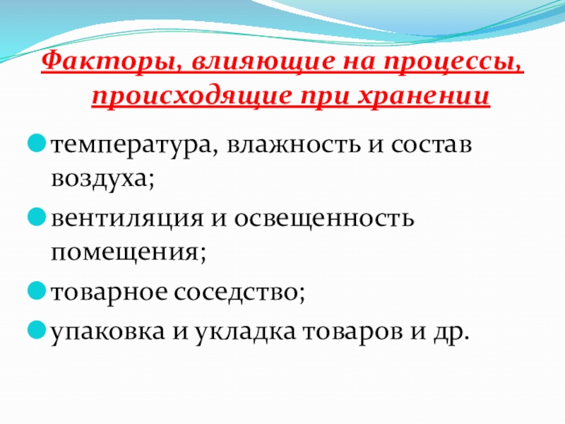 Слайд 32Факторы, влияющие на процессы, происходящие при хранении