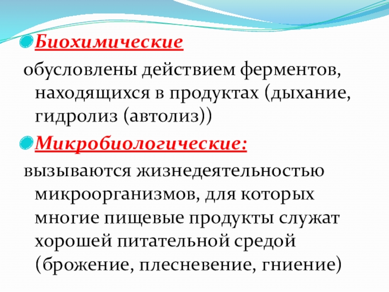 обусловлены действием ферментов, находящихся в продуктах (дыхание, гидролиз (автолиз))