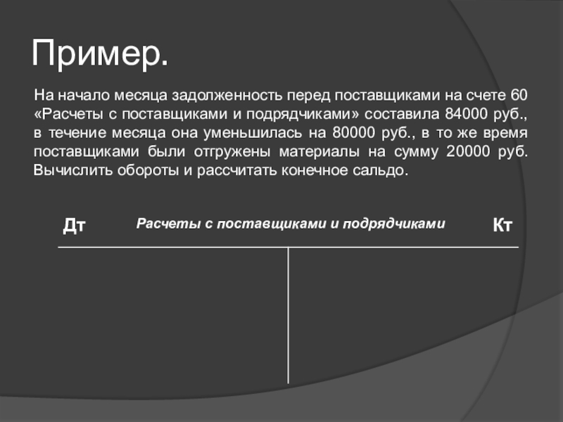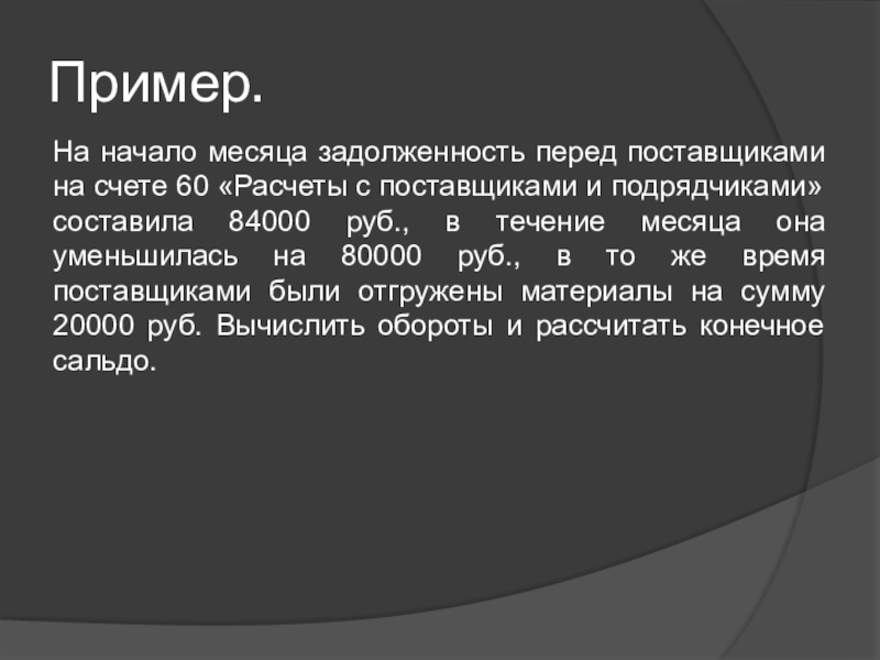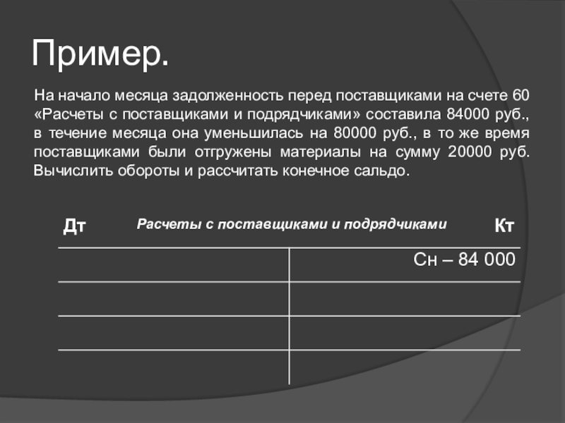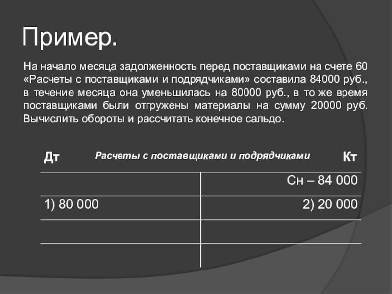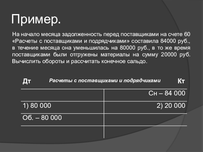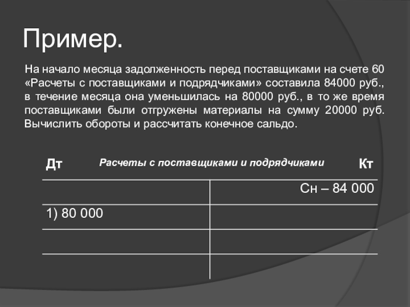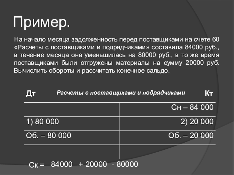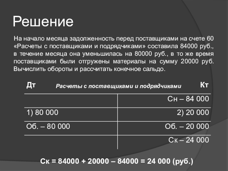 поставщиками и подрядчиками» составила 84000 руб., в течение месяца она уменьшилась на 80000 руб., в то же время поставщиками были отгружены материалы на сумму 20000 руб. Вычислить обороты и рассчитать конечное сальдо.