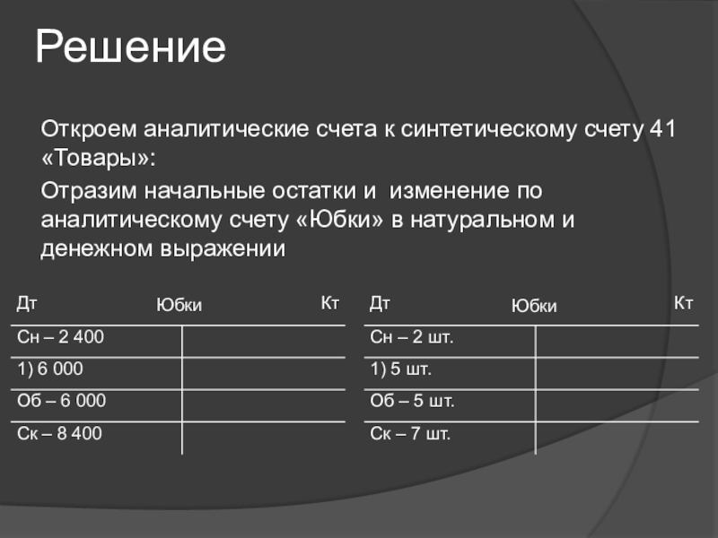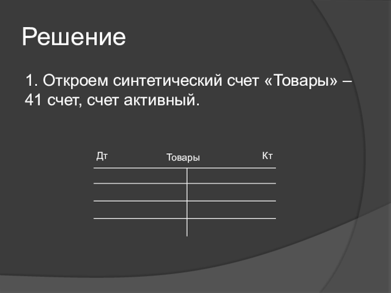 1. Откроем синтетический счет «Товары» – 41 счет, счет активный.