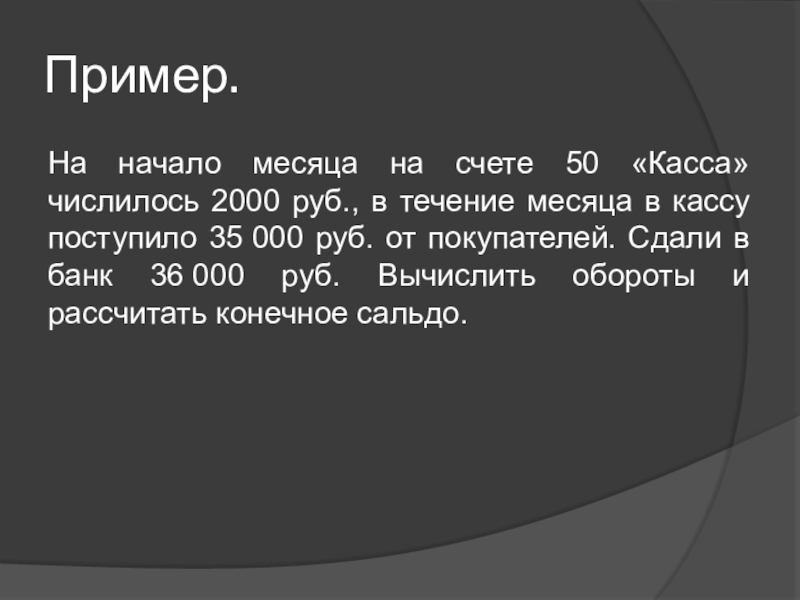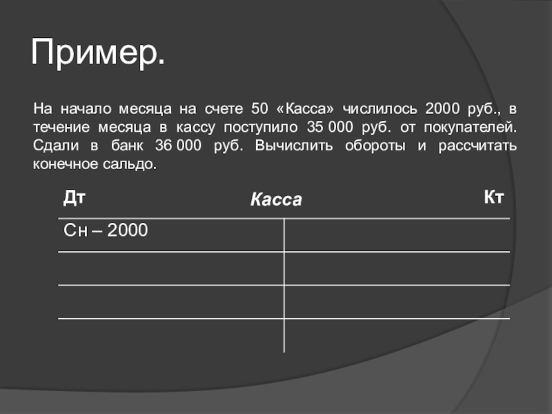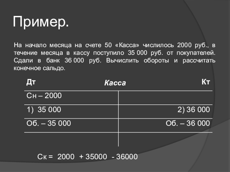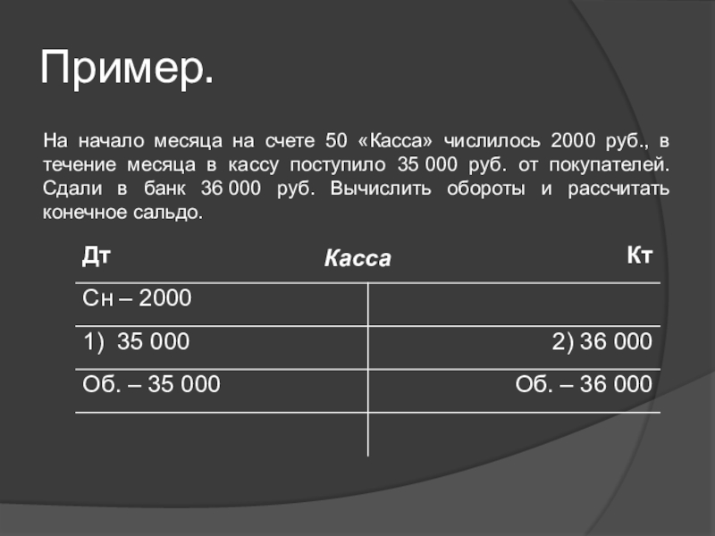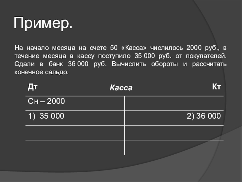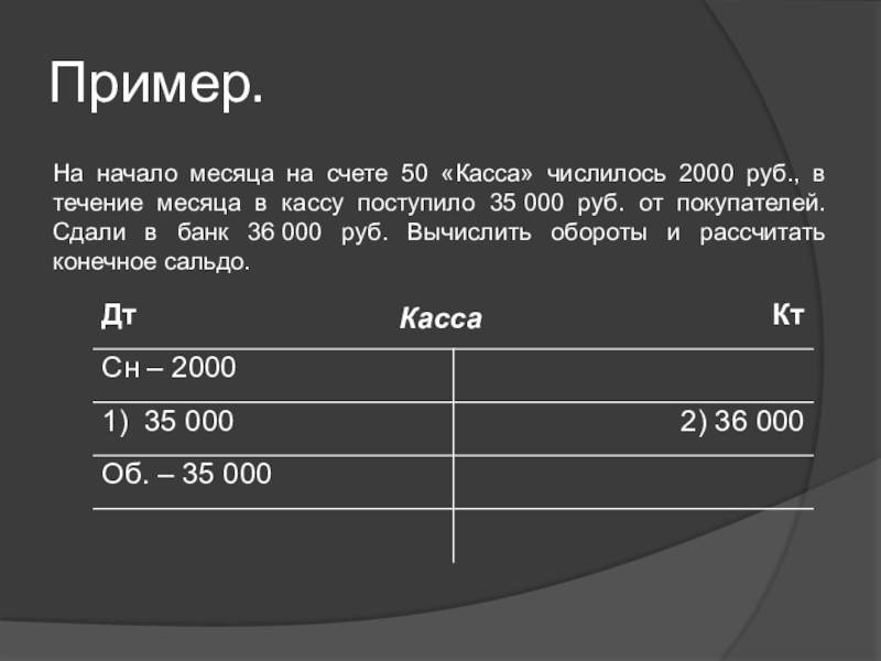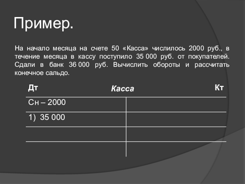 течение месяца в кассу поступило 35 000 руб. от покупателей. Сдали в банк 36 000 руб. Вычислить обороты и рассчитать конечное сальдо.