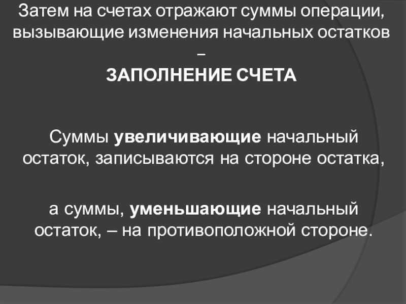 Слайд 12Затем на счетах отражают суммы операции, вызывающие изменения начальных остатков –