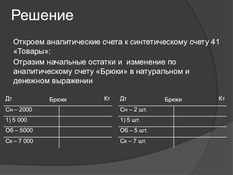 изменение по аналитическому счету «Брюки» в натуральном и денежном выражении