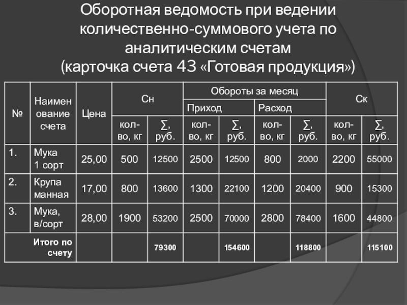 Слайд 85Оборотная ведомость при ведении количественно-суммового учета по аналитическим счетам
