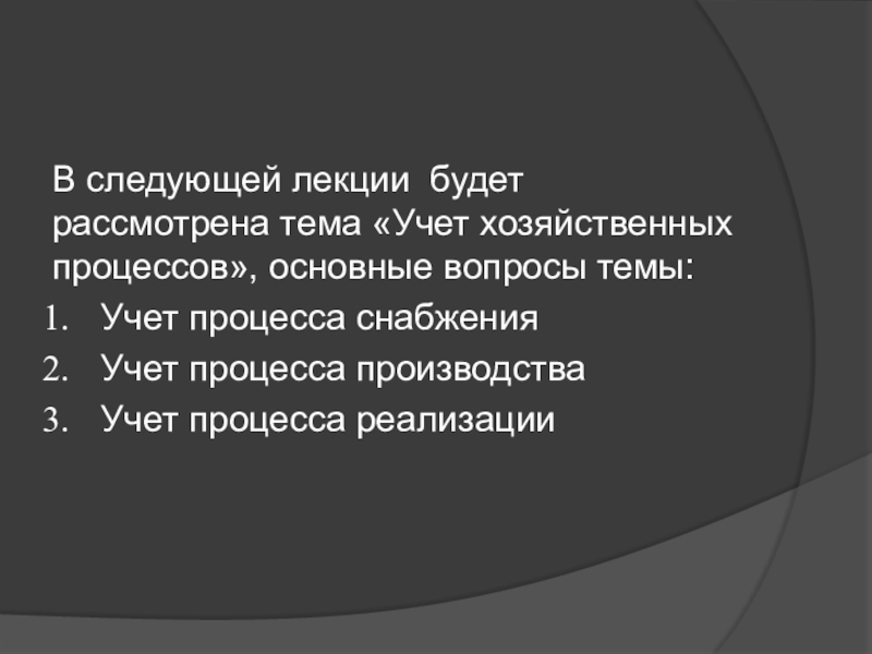 Слайд 87В следующей лекции будет рассмотрена тема «Учет хозяйственных процессов», основные вопросы