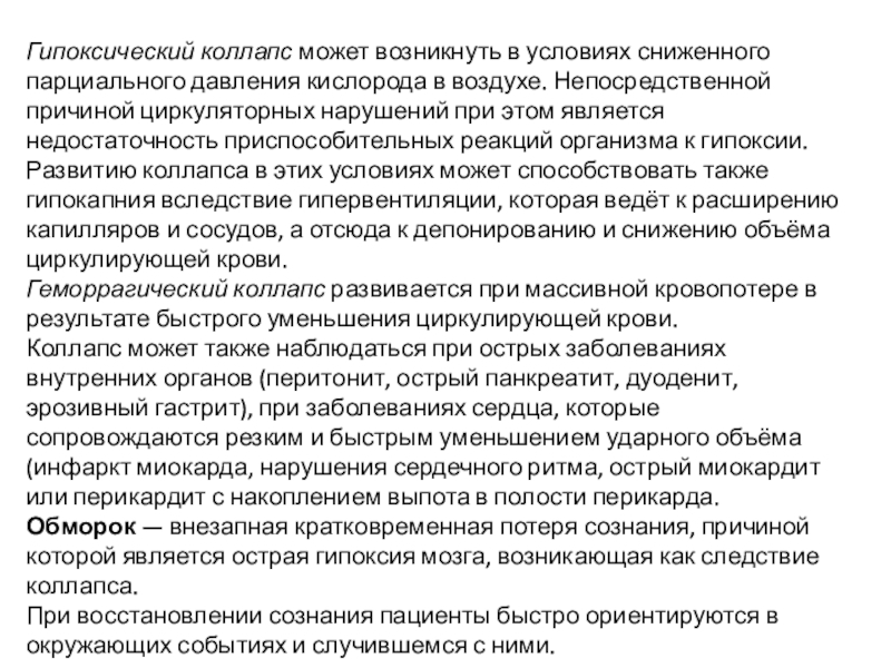 воздухе. Непосредственной причиной циркуляторных нарушений при этом является недостаточность приспособительных реакций организма к гипоксии. Развитию коллапса в этих условиях может способствовать также гипокапния вследствие гипервентиляции, которая ведёт к расширению капилляров и сосудов, а отсюда к депонированию и снижению объёма циркулирующей крови.