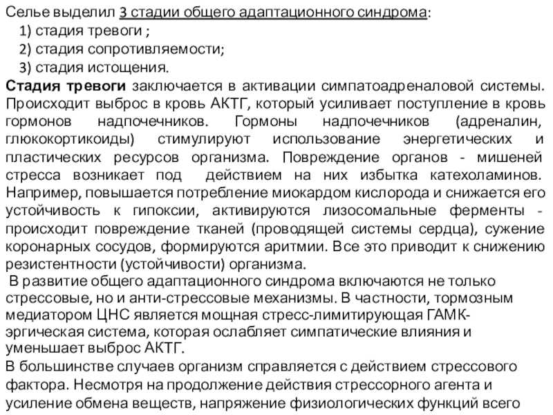 Слайд 4Селье выделил 3 стадии общего адаптационного синдрома: