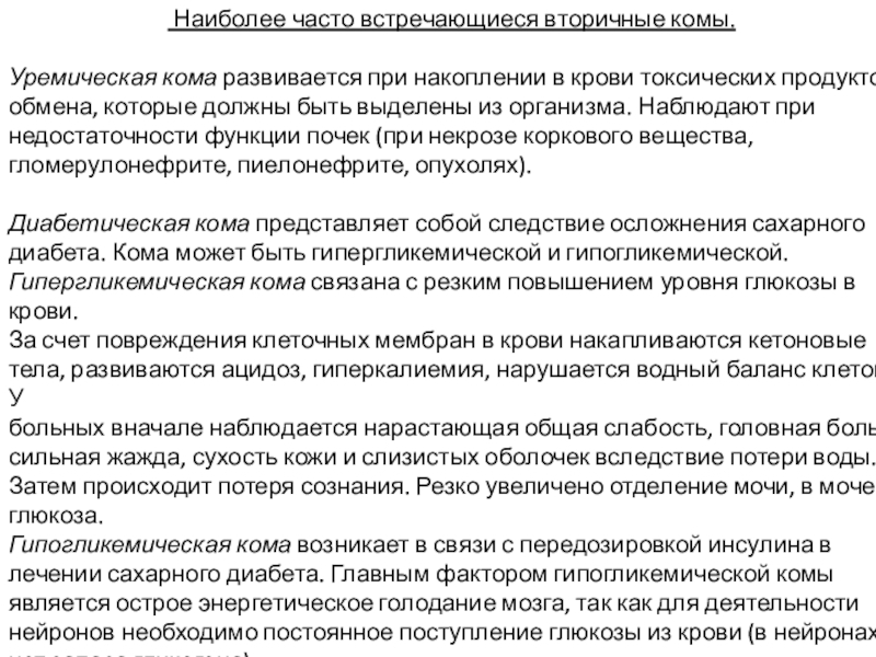 - вторичные, обусловленные нарушением функции органов и тканей, вторично приводящими к альтерации мозга, например кома при уремии, сахарном диабете, печеночной недостаточности и т. п.